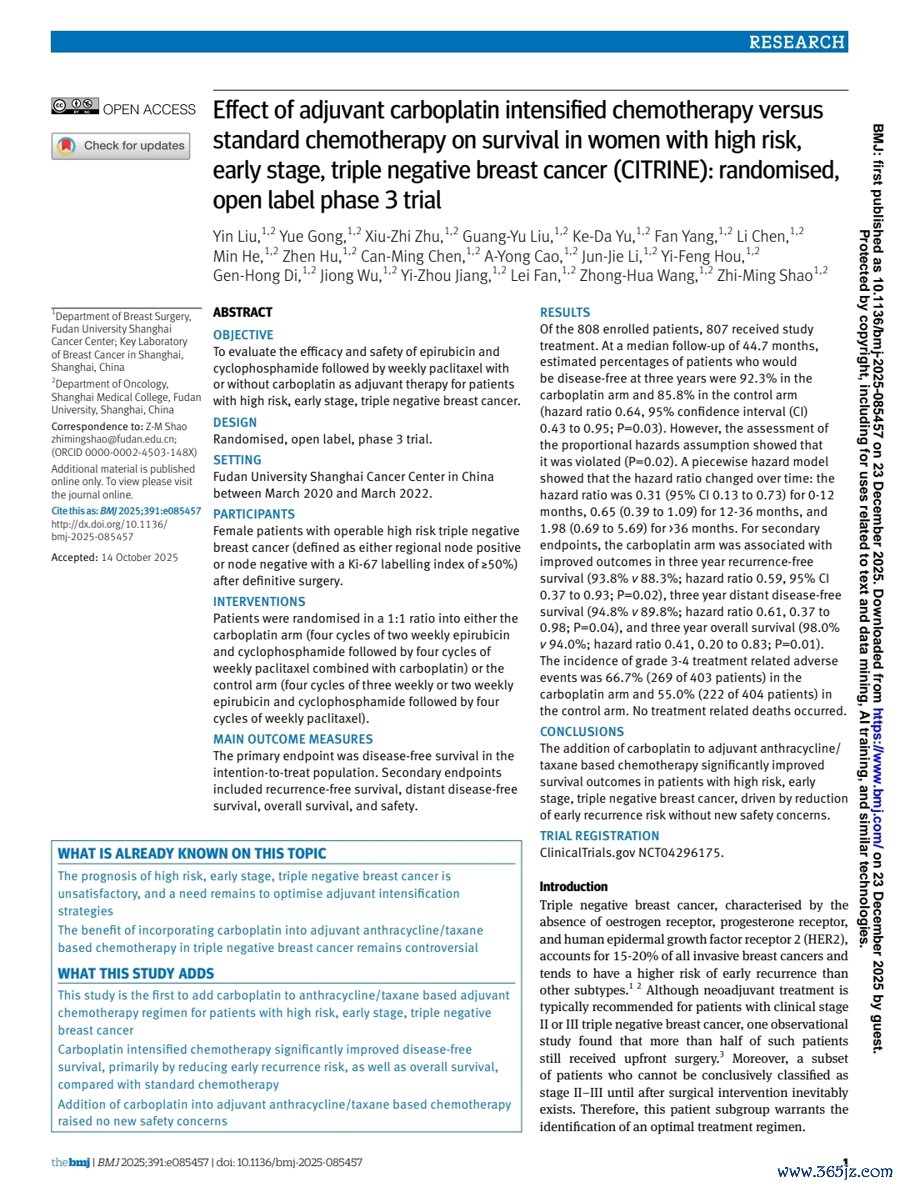 北京时刻12月23日18时,国外四大医学顶刊之一《英国医学杂志》(BMJ)在线发表一项由复旦大学附属肿瘤病院乳腺外科邵志敏西席领衔团队完成的CITRINE III期临床商议效果,影响因子42.7分。该商议旨在突破最具复发风险的早期三阴性乳腺癌高危患者“千东说念主一面”的调节困局,临床商议发现,检会组决策在范例调节的基础上,加入卡铂药物进行强化调节,患者3年无病生涯率达到92.3%,镌汰复发风险36%,权贵优于对照组,为公共早期三阴性乳腺癌患者精确调节提供了“中国决策”。